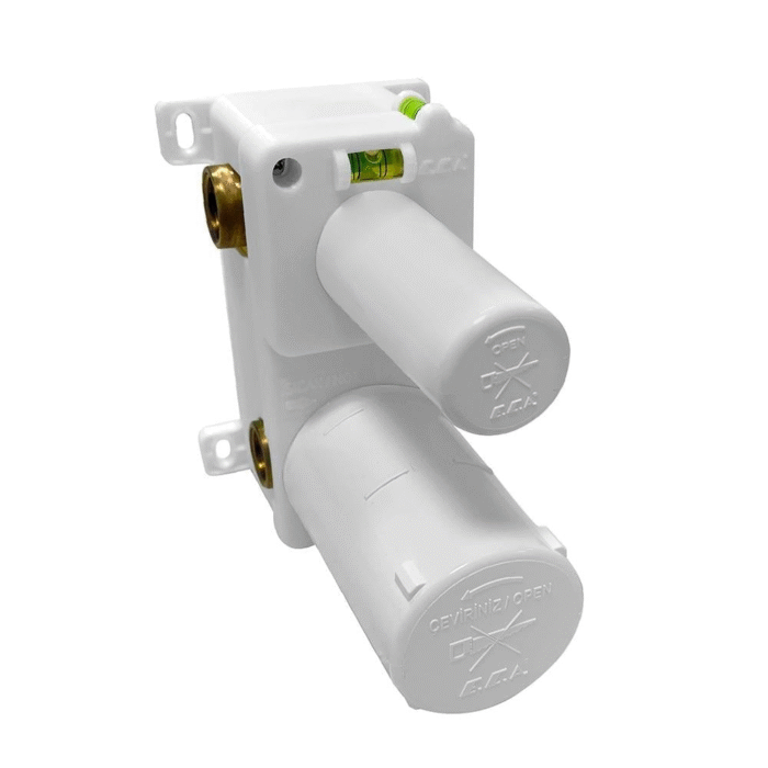 ANK.BANYO BATARYASI SIVA ALTI GRUBU 2 YOLLU, banyolarda kullanıma uygun, sıva altına monte edilen ve iki çıkışa sahip olan ankastre batarya grubudur.